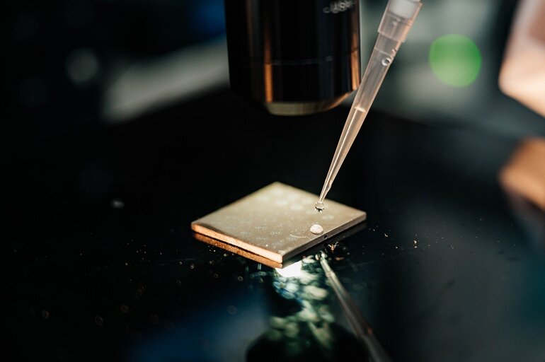 В своей работе политехники использовали пластины из алюминиево-магниевого сплава — материала, который часто встречается в системах охлаждения. С помощью лазера они нанесли на металл микроскопическую текстуру, а затем придали разным участкам поверхности противоположные свойства: одни стали отталкивать воду (супергидрофобные), а другие — наоборот, притягивать ее (супергидрофильные). За процессом испарения капель на таких необычных «платформах» следили при температурах от 20°С до 300°С.