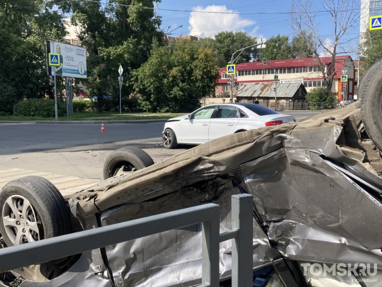 Обновлено. Корреспондент Tomsk.ru с места событий передает, что в результате столкновения автомобиль Hyundai перевернулся на крышу. Заметно также, что в обеих машинах сработали подушки безопасности.